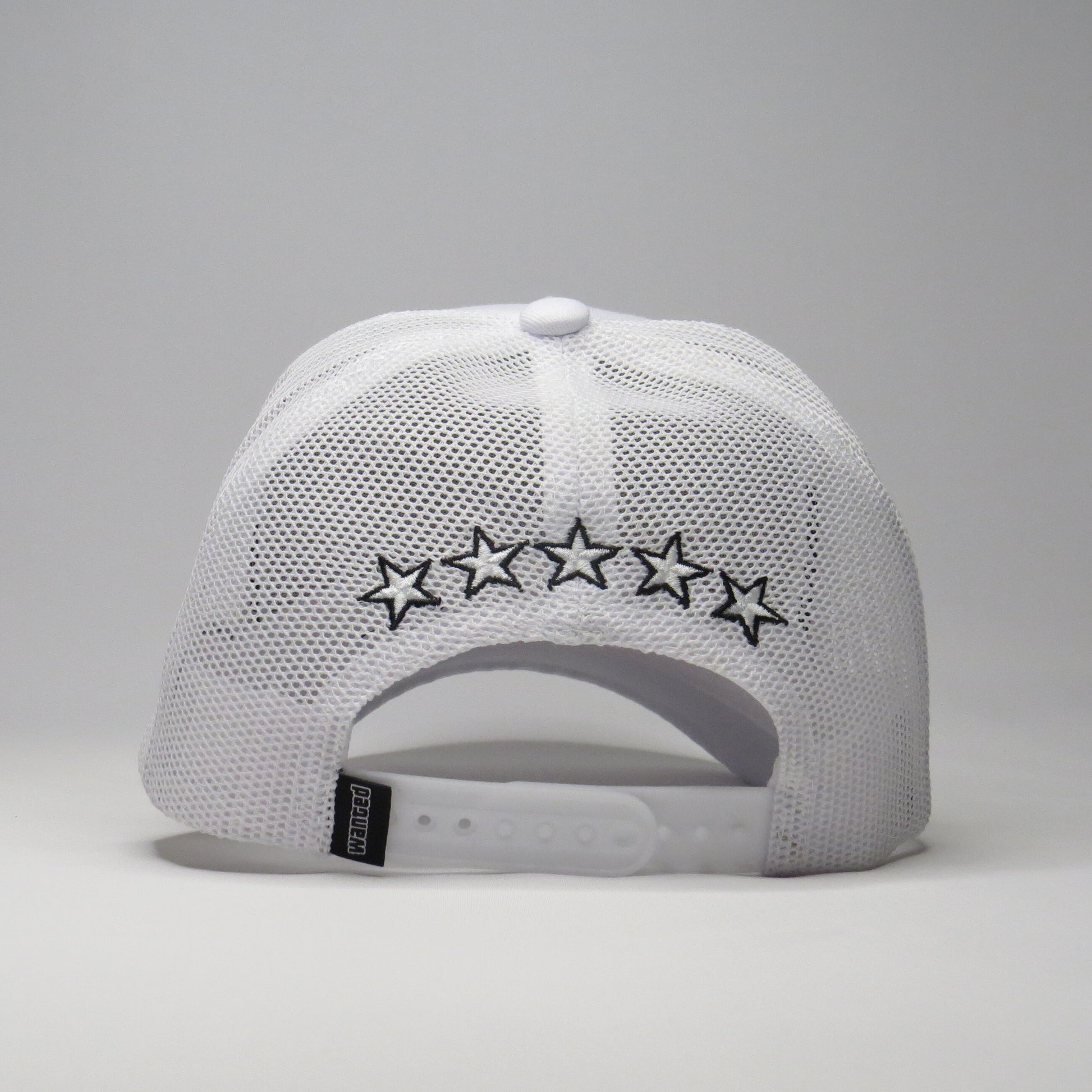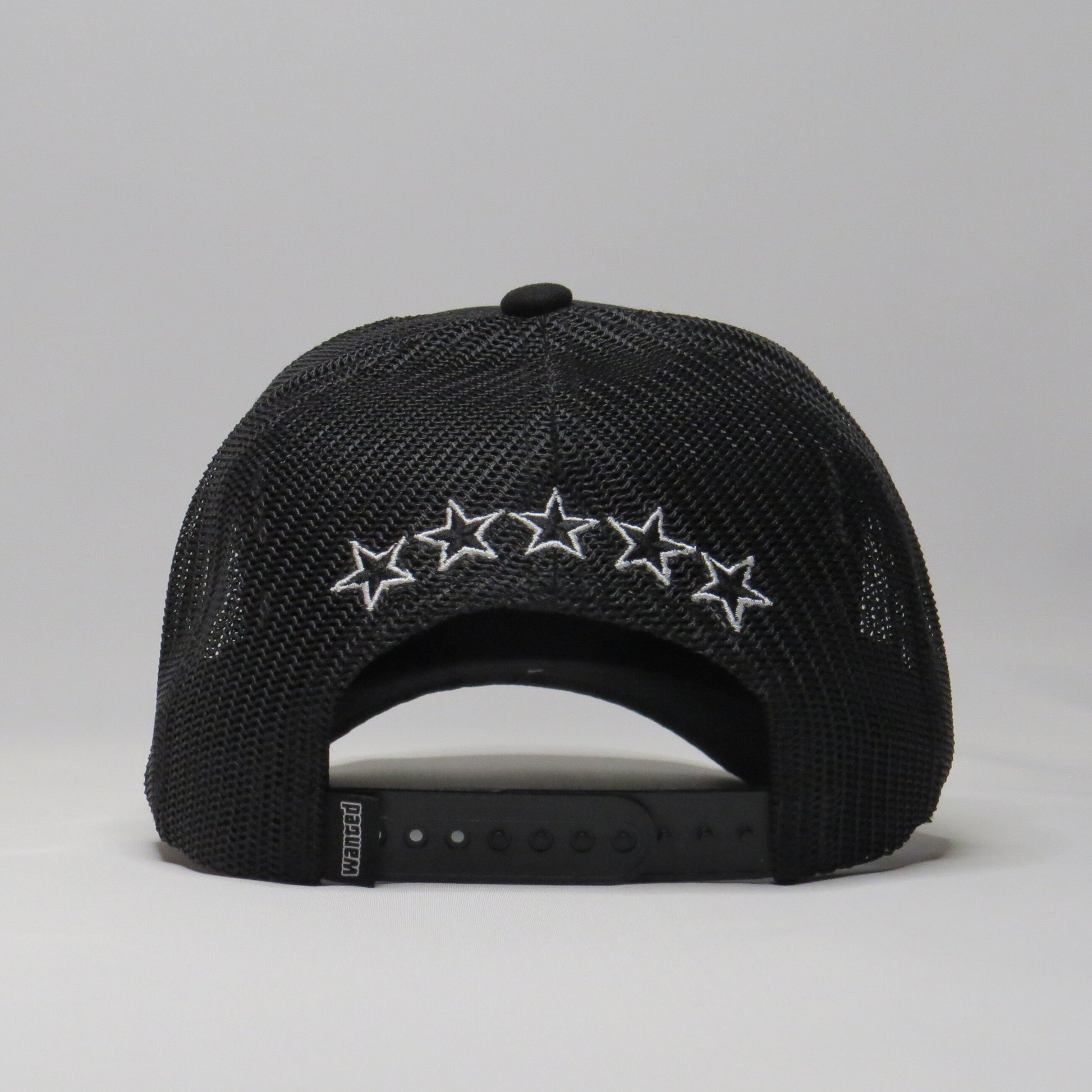 The front features a large logo, with a smaller logo on the left side. Five stars on the back for a stylish detail. The adjustable strap at the back includes a unique “WANTED” label.
